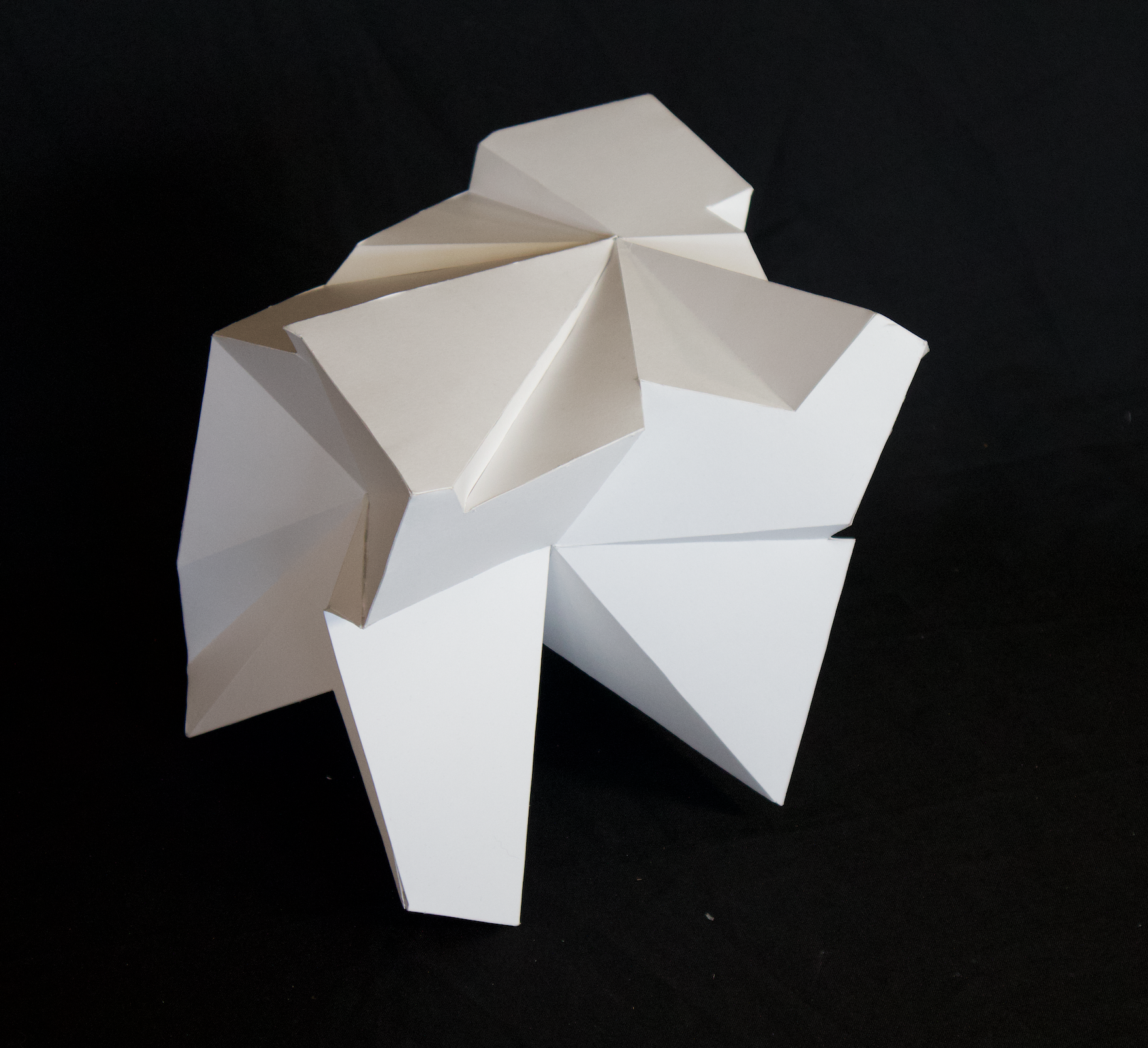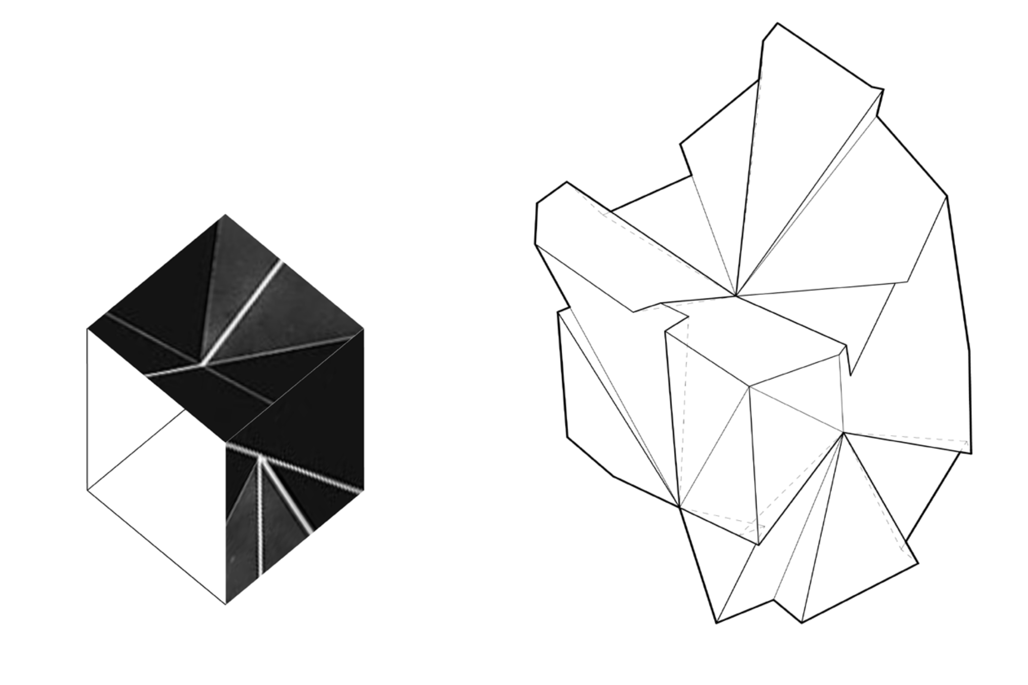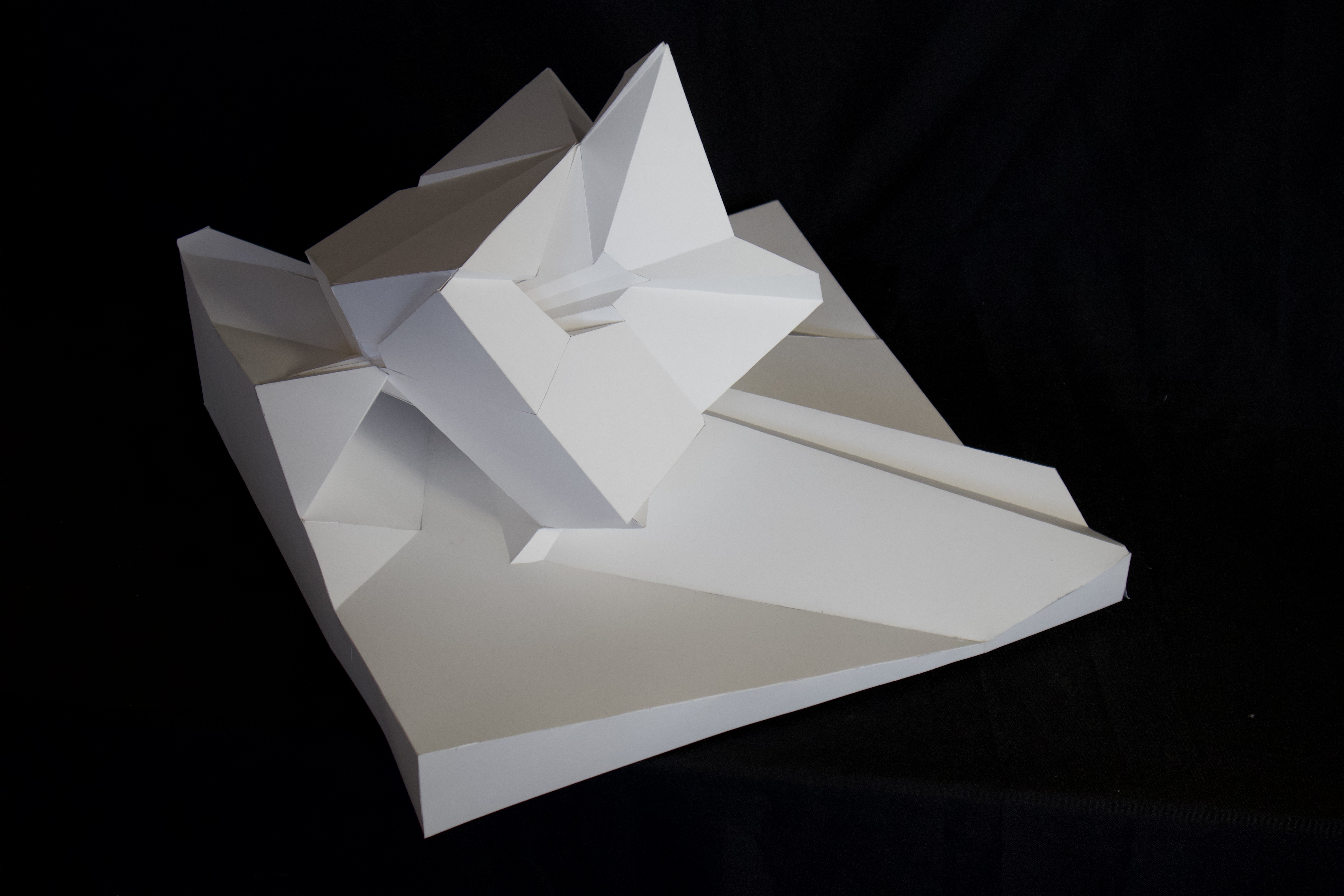 My language took shape in the form of “pinch points” as I negotiated the images onto an orthographic projection of a cube. Lines became pleats, creases, or folds roughly based on line weights in each crop. For each side of the cube, every plane intersected with a single focal point.