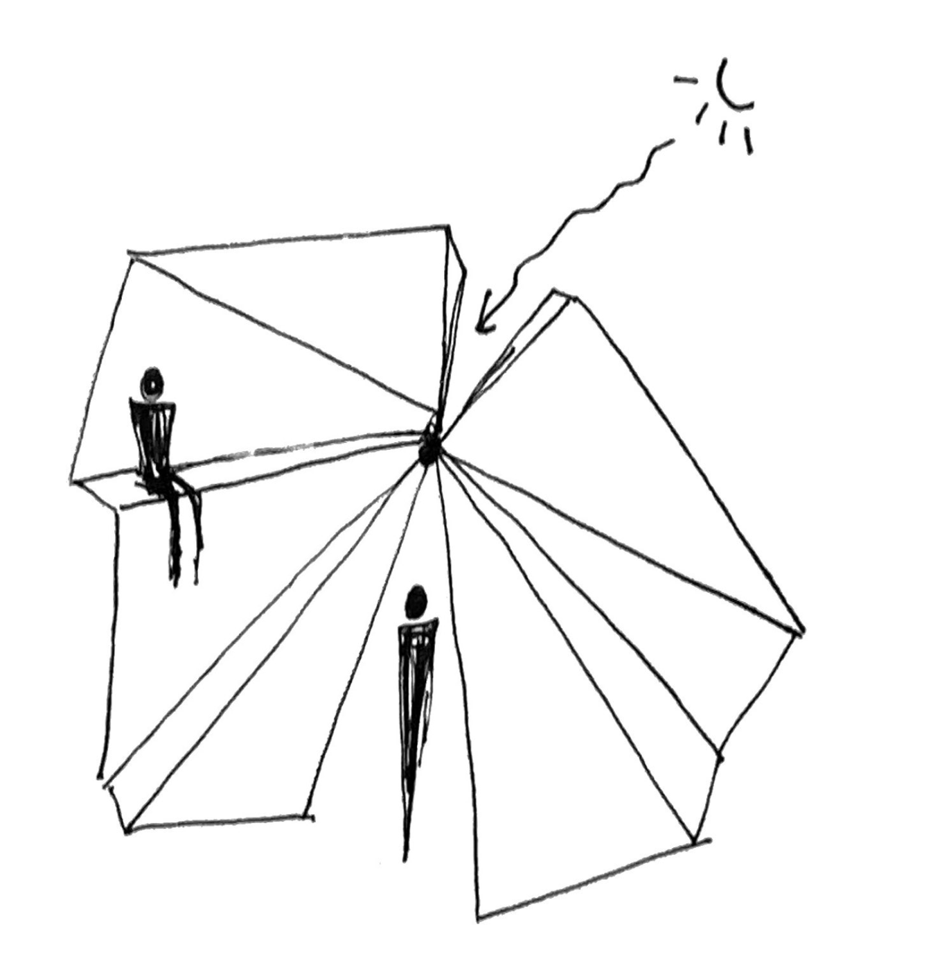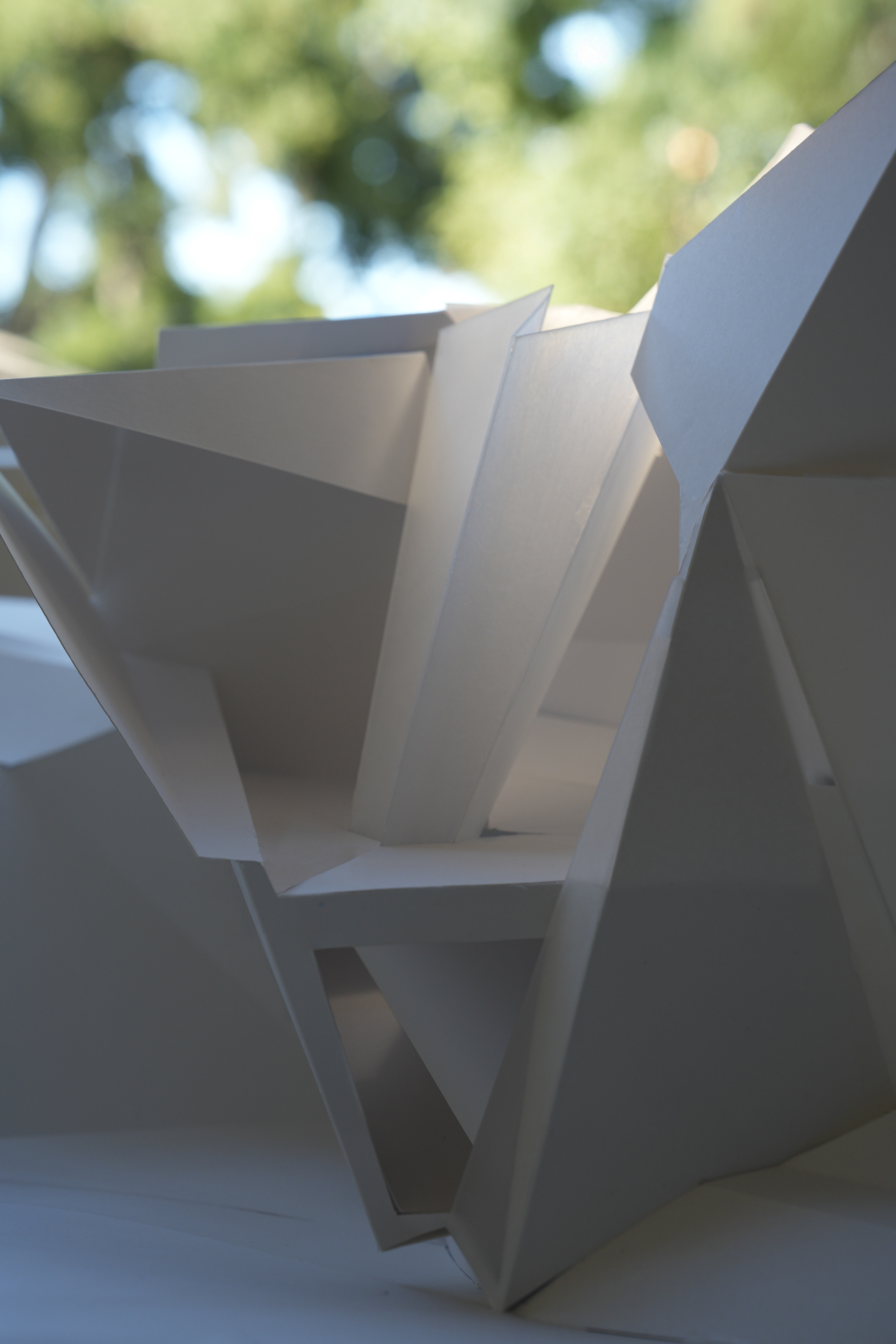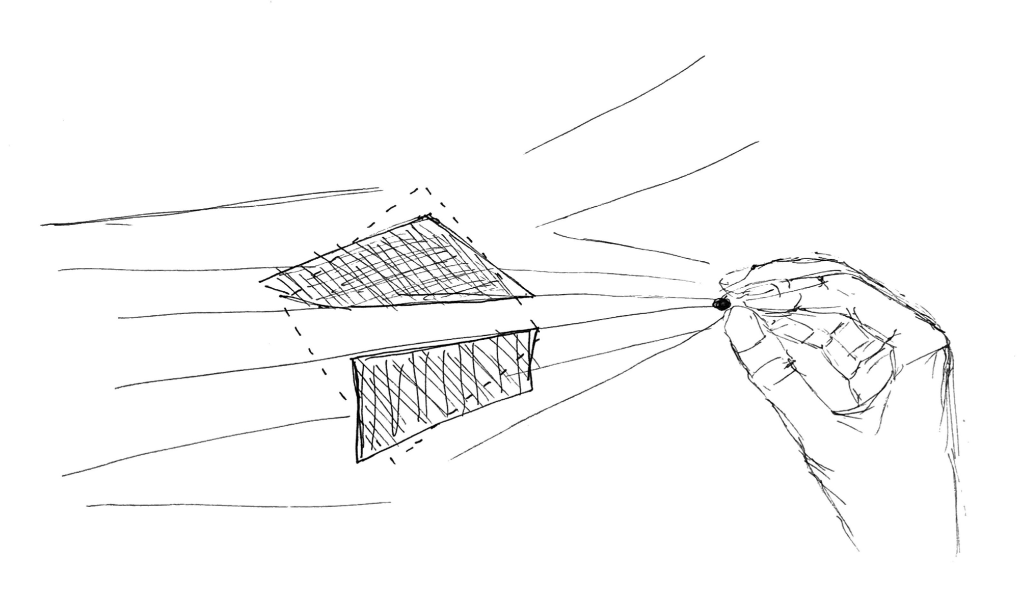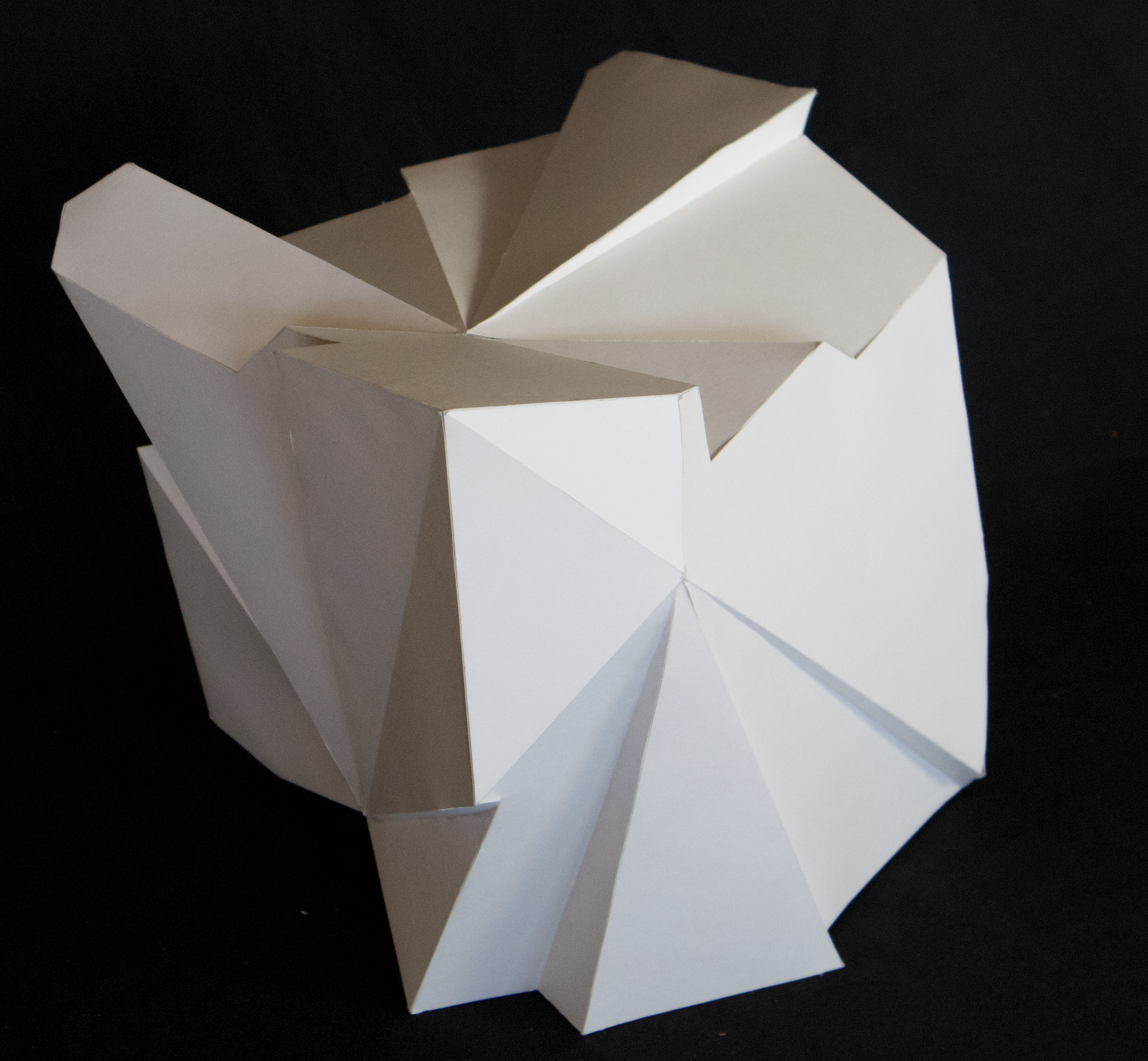 My language took shape in the form of “pinch points” as I negotiated the images onto an orthographic projection of a cube. Lines became pleats, creases, or folds roughly based on line weights in each crop. For each side of the cube, every plane intersected with a single focal point.